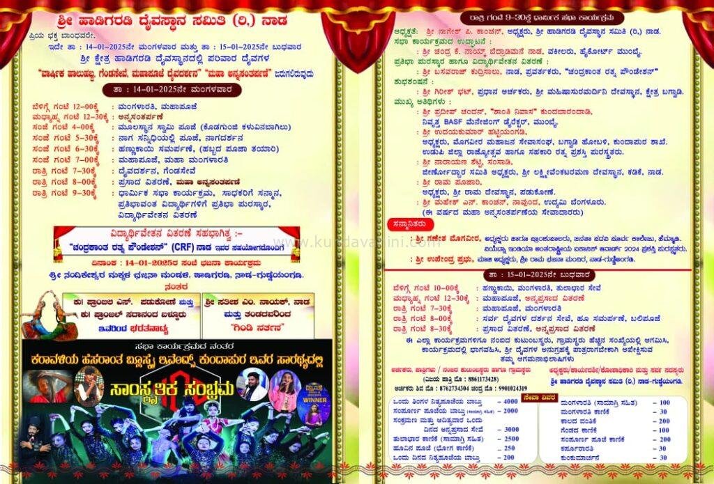ಕುಂದಾಪುರ (ಜ. 03): ತಾಲೂಕಿನ ನಾಡದ ಶ್ರೀ ಹಾಡಿಗರಡಿ ದೈವಸ್ಥಾನದ ವಾರ್ಷಿಕ ವಾರ್ಷಿಕ ಜಾತ್ರಾ ಮಹೋತ್ಸವವು 2025 ರ ಜನವರಿ 14 ಮತ್ತು 15ರಂದು ನಡೆಯಲಿದೆ.