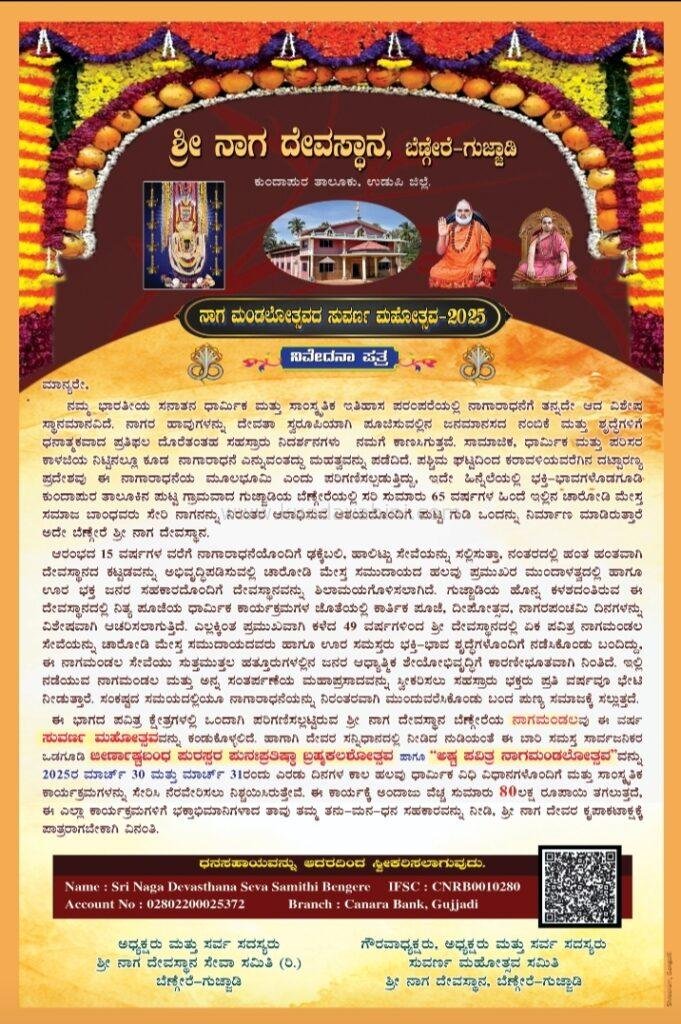 ನಾಗಮಂಡಲೋತ್ಸವದ ಸುವರ್ಣ ಮಹೋತ್ಸವದ ಹಿನ್ನೆಲೆಯಲ್ಲಿ ಮಾರ್ಚ್ 26 ರಂದು ಜೀರ್ಣಸ್ತ ಬಂದ, ಪುನರ್ ಪ್ರತಿಷ್ಠೆ ಹಾಗೂ ಕಳಸಾಭಿಷೇಕ ನಡೆಯಲಿದ್ದು, ಇದನ್ನು ಶೃಂಗೇರಿ ಶ್ರೀ ಜಗದ್ಗುರು ಭಾರತೀಯ ತೀರ್ಥ ಸ್ವಾಮೀಜಿಗಳಾದ ಶ್ರೀ ಶ್ರೀ ಶ್ರೀ ವಿದುಶೇಖರ ತೀರ್ಥಂಗಳ ರವರು ನೆರವೇರಿಸಲಿದ್ದಾರೆ.