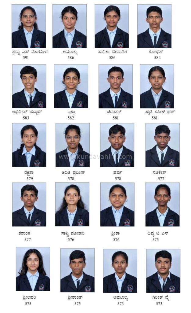 ವಿಜ್ಞಾನ ವಿಭಾಗದಲ್ಲಿ- ಶ್ರದ್ದಾ ಎಸ್ ಮೊಗವೀರ (591), ಅಮೂಲ್ಯ (586 ) ಸಾನಿಕ ಎಸ್ ದೇವಾಡಿಗ (586 ) ಶೋಭಿತ್ (584) ಅಭಿದೀಪ್ ಹೆಬ್ಬಾರ್ (583 ) ಇಶ್ರ್ರಾ (582) ಚಿರಂತನ್ (581 ) ಸ್ವಾತಿ ಭಟ್ (581 ) ರಕ್ಷಿತಾ (579 ) ಅದಿತಿ ಪ್ರವೀಣ್ (578 ) ಹರ್ಷ (578) ನಚಿಕೇತ್ (577) ಶಶಾಂಕ್ (577) ಸಾನ್ವಿ ಪೂಜಾರಿ (576) ಶ್ರೀಶಾ (576) ದಿವ್ಯಾ ಟಿ .ಎಸ್ (575) ಶ್ರೀಲಹರಿ (575 ) ಶ್ರೀಶಾಂತ್ (575 ) ಅಮೂಲ್ಯ (573 ) ಗಿರೀಶ್ ವಿ ಪೈ (573 ) ವಿಸ್ಮಯ (573 ) ಪ್ರಸಾದ್ (572 ) ಸಹನಾ ಶೆಟ್ಟಿ (572 ) ಮೈತ್ರಿ ಪೂಜಾರಿ (571 )