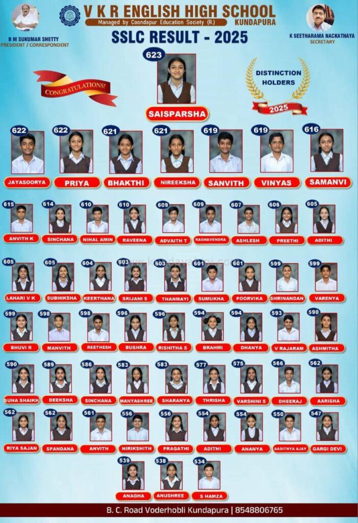 ಕುಂದಾಪುರ(ಮೇ .03) : ಕುಂದಾಪುರ ಎಜ್ಯುಕೇಶನ್ ಸೊಸೈಟಿ (ರಿ.) ಪ್ರವರ್ತಿತ ವಿ. ಕೆ. ಆರ್. ಆಚಾರ್ಯ ಸ್ಮಾರಕ ಆಂಗ್ಲ ಮಾಧ್ಯಮ ಪ್ರೌಢ ಶಾಲೆ ಕುಂದಾಪುರ ಇಲ್ಲಿ ಈ ಬಾರಿಯ ಎಸ್. ಎಸ್. ಎಲ್. ಸಿ ಪರೀಕ್ಷೆಗೆ 106 ವಿದ್ಯಾರ್ಥಿಗಳು ಹಾಜರಾಗಿದ್ದು, 56 ವಿದ್ಯಾರ್ಥಿಗಳು ವಿಶಿಷ್ಟ ದರ್ಜೆಯಲ್ಲಿ ಮತ್ತು 41 ವಿದ್ಯಾರ್ಥಿಗಳು ಪ್ರಥಮ ದರ್ಜೆಯಲ್ಲಿ ತೇರ್ಗಡೆ ಹೊಂದಿರುತ್ತಾರೆ.