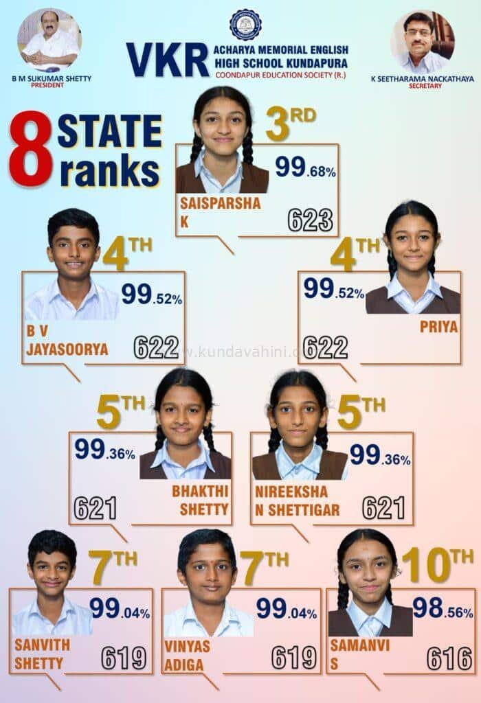 ಕುಂದಾಪುರ (ಮೇ, 03): ಕುಂದಾಪುರದ ಪ್ರತಿಷ್ಠಿತ ಶಿಕ್ಷಣ ಸಂಸ್ಥೆಯಾದ ವಿ. ಕೆ. ಆರ್. ಆಚಾರ್ಯ ಸ್ಮಾರಕ ಆಂಗ್ಲ ಮಾಧ್ಯಮ ಪ್ರೌಢ ಶಾಲೆ 2024-25 ನೇ ಸಾಲಿನ ಎಸ್ ಎಸ್ ಎಲ್ ಸಿ ಪರೀಕ್ಷೆಯಲ್ಲಿ ಶೇಕಡಾ 99.05 ಫಲಿತಾಂಶವನ್ನು ದಾಖಲಿಸುವುದರ ಜೊತೆಗೆ 8 ರ್ಯಾಂಕ್ ಗಳನ್ನು ಪಡೆದುಕೊಂಡಿದೆ.