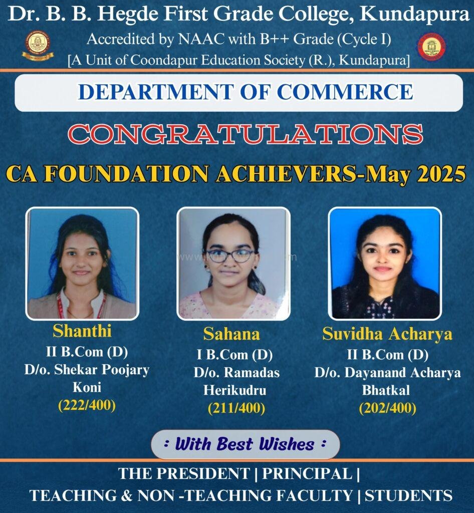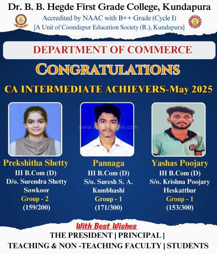 ಕುಂದಾಪುರ(ಜು. 06): ಇನ್ಸ್ಟಿಟ್ಯೂಟ್ ಆಫ್ ಚಾರ್ಟರ್ಡ್ ಅಕೌಂಟೆಂಟ್ಸ್ ಆಫ್ ಇಂಡಿಯಾ ನಡೆಸುವ ಸಿಎ ಫೌಂಡೇಶನ್ ಹಾಗೂ ಇಂಟರ್ಮೀಡಿಯೇಟ್ ಪರೀಕ್ಷೆಯಲ್ಲಿ ಡಾ| ಬಿ ಬಿ ಹೆಗ್ಡೆ ಪ್ರಥಮ ದರ್ಜೆ ಕಾಲೇಜಿನ ವಾಣಿಜ್ಯ ವಿಭಾಗದ ವಿದ್ಯಾರ್ಥಿಗಳು ಉತ್ಕೃಷ್ಟ್ಟ ಸಾಧನೆಗೈದಿದ್ದಾರೆ.