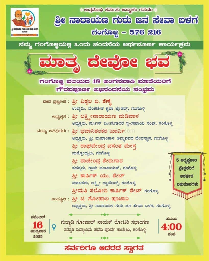 ಗಂಗೊಳ್ಳಿ( ನ .12): ಇಲ್ಲಿನ ಶ್ರೀ ನಾರಾಯಣ ಗುರು ಜನಸೇವಾ ಬಳಗ(ರಿ.), ವತಿಯಿಂದ ಗಂಗೊಳ್ಳಿ ವಲಯದ ಅಂಗನವಾಡಿ ಮತ್ತು ಶಿಶುಮಂದಿರದ 18 ಕಾರ್ಯಕರ್ತೆಯರು ಮತ್ತು ಸಹಾಯಕಿಯರನ್ನು ಗೌರವಿಸುವ ಅಭಿನಂದನಾ ಸಮಾರಂಭ ಮಾತೃ ದೇವೋಭವ ಗಂಗೊಳ್ಳಿಯ ಗುಜ್ಜಾಡಿ ಗೋಪಾಲ್ ನಾಯಕ್ ರೋಟರಿ ಸಭಾಂಗಣದಲ್ಲಿ ನವೆಂಬರ್ 16ರ ಭಾನುವಾರ ಸಂಜೆ 4:00 ಗಂಟೆಗೆ ನಡೆಯಲಿದೆ.