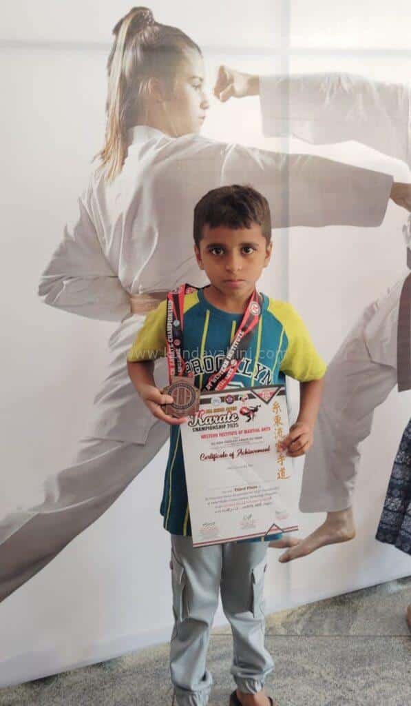 ಮಂಗಳೂರು( ಡಿ ,26) : ಇಲ್ಲಿನ ಫಾದರ್ ಮುಲ್ಲರ್ ಒಳಾಂಗಣ ಕ್ರೀಡಾಂಗಣದಲ್ಲಿ ನಡೆದ ಅಖಿಲ ಭಾರತ ಮಟ್ಟದ ಕರಾಟೆ ಚಾಂಪಿಯನ್ಶಿಪ್ 2025 ಇದರ ಬಾಲಕರ ವೈಟ್ ಬೆಲ್ಟ್ ಕುಮಿಟೆ ವಿಭಾಗದಲ್ಲಿ ಗುಜ್ಜಾಡಿ ಗ್ರಾಮದ ಕಂಚುಗೋಡು ನಿವಾಸಿ, ಈಜುಪಟು ನಾಗರಾಜ ಖಾರ್ವಿ ಮತ್ತು ಕೃಪಾ ಖಾರ್ವಿಯವರ ಪುತ್ರ, ಕುಂಟಿಕಾನ ಸೈಂಟ್ ಆ್ಯನ್ಸ್ ಪ್ರೌಢಶಾಲೆಯ 4ನೆಯ ತರಗತಿ ವಿದ್ಯಾರ್ಥಿ ಸಂಚಿತ್ ಖಾರ್ವಿ ಕಂಚಿನ ಪದಕ ಪಡೆದುಕೊಂಡಿದ್ದಾನರೆ.