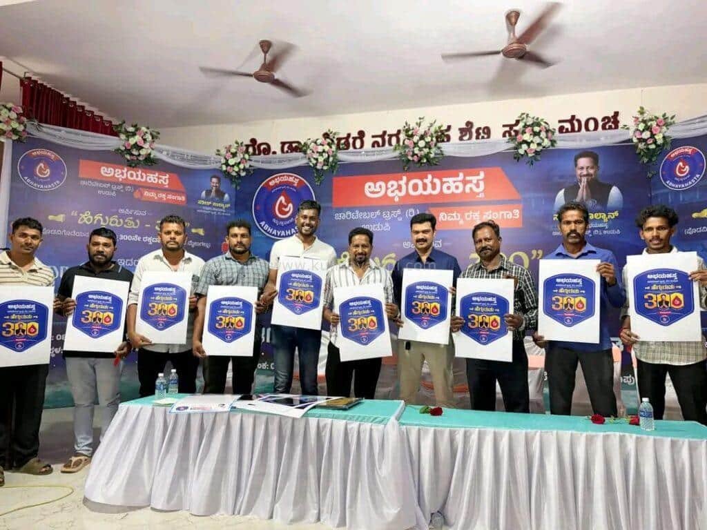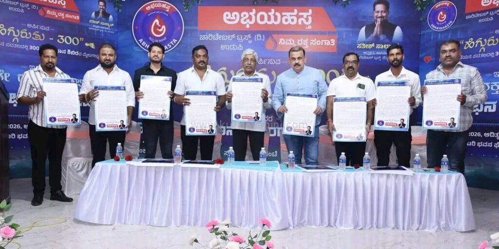 ಅಭಯಹಸ್ತ ಚಾರಿಟೇಬಲ್ ಟ್ರಸ್ಟ್ ರಿ. ಉಡುಪಿ ಇದರ ಸಾರಥ್ಯದಲ್ಲಿ ಹಮ್ಮಿಕೊಳ್ಳಲಾಗುತ್ತಿರುವ 300ನೇ ರಕ್ತದಾನ ಶಿಬಿರದ ಲಾಂಛನ ಬಿಡುಗಡೆ ಸಮಾರಂಭವಾದ ಹೆಗ್ಗುರುತು – 300 ( ಪೊಡವಿಗೊಡೆಯನ ಪದತಲದಲ್ಲಿ ಅಭಯಹಸ್ತ 300ನೇ ರಕ್ತದಾನ ಶಿಬಿರದ ಮೈಲುಗಲ್ಲು) ಎಂಬ ಯಶಸ್ವಿ ಸಮಾರಂಭವನ್ನು ಕುಂದಾಪುರದ ರೋಟರಿ ಭವನದಲ್ಲಿ ದಿನಾಂಕ 08/02/2026 ರಂದು ಆಯೋಜಿಸಲಾಗಿತ್ತು. ಕುಂದಾಪುರದ ಆದರ್ಶ ಆಸ್ಪತ್ರೆಯ ಡಾ. ಆದರ್ಶ್ ಹೆಬ್ಬಾರ್ ಅವರು ಕಾರ್ಯಕ್ರಮದ ಅಧ್ಯಕ್ಷತೆಯನ್ನು ವಹಿಸಿದ್ದರು.